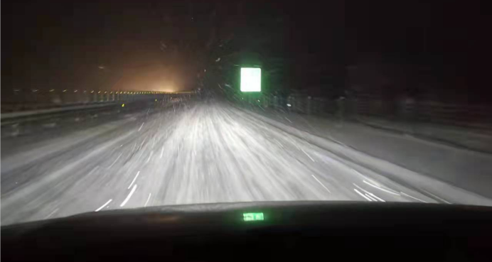 驱车100公里左右,天空开始飘雪。短短半小时,车外已经是白雪皑皑一片,大雪覆盖了道路。天色已晚,夜幕降临,恶劣天气加上光线黑暗,只能降低车速。