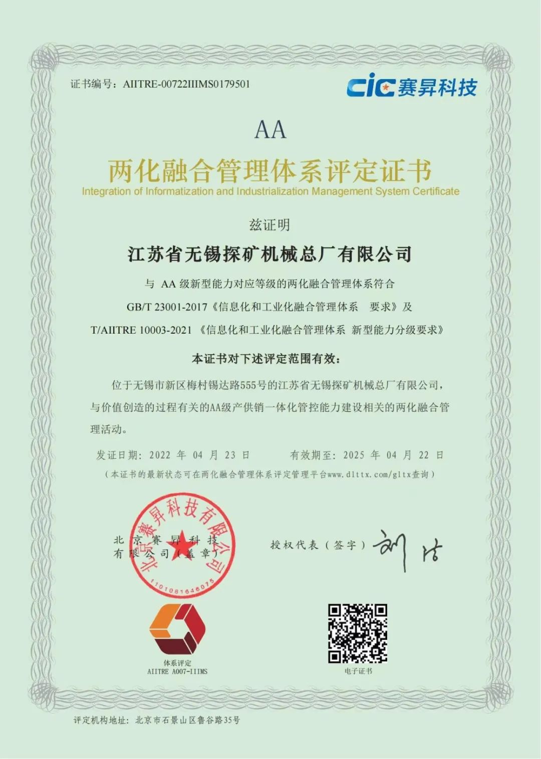 锡探科技获2022年度两化融合管理体系AA级评级认证,标志着锡探科技的信息化与工业化深度融合获得权威认可。