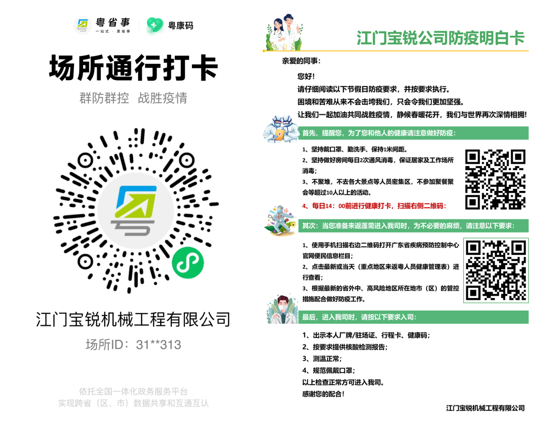 为认真贯彻落实新型冠状病毒感染的肺炎防控工作精神,切实做好江门宝锐机械工程有限公司的新冠防治工作,遵循“以人为本,预防为主”的原则,依照法律法规和政策办事,强化疫情防控宣传教育,增强全体员工安全防护意识,公司成立疫情防控小组,做好监督、检查和维护工作,各部门人员相互配合,认真落实疫情防控的工作。