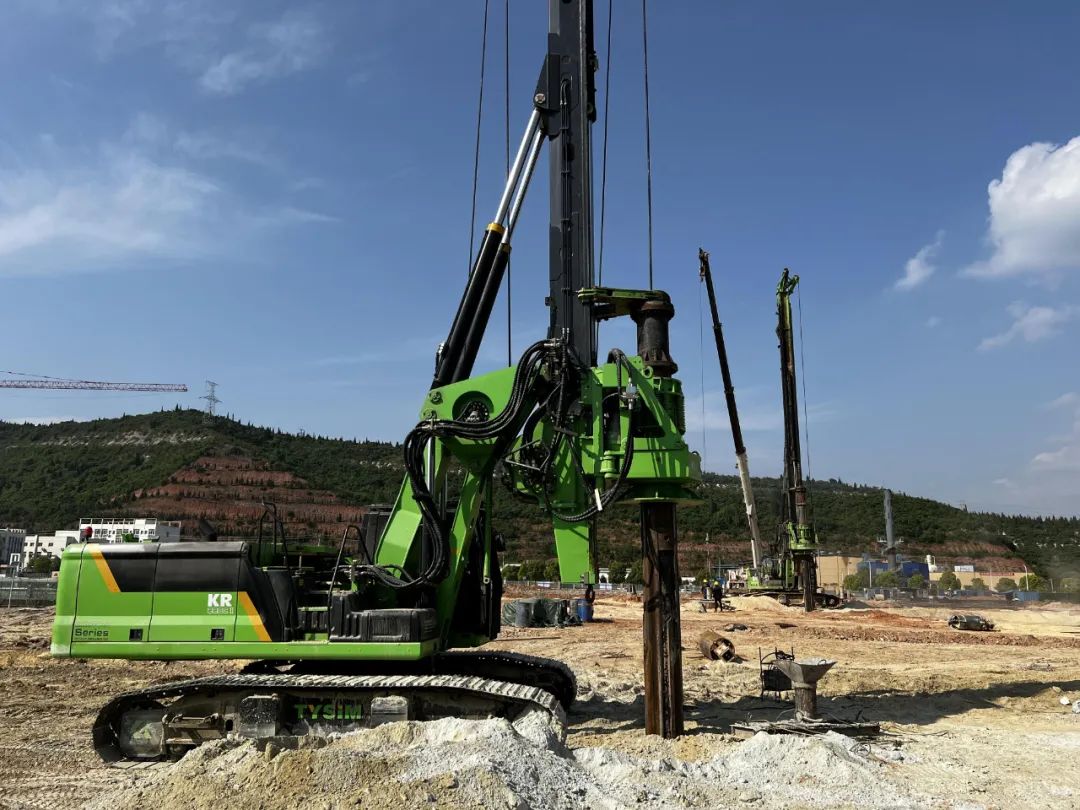 据悉该工程现场地质情况复杂,地质条件主要为回填土、强风化灰岩。现场钻孔桩径600mm和800mm两种桩型,孔深11m~20m,地层复杂,施工难度大。泰恒基础KR220C单台十小时施工300米,顺利完成成孔施工任务,客户对使用KR220C旋挖钻机克服各种困难,满足设计的桩基要求,钻机稳定可靠,主要还省油,整体施工进度非常满意。