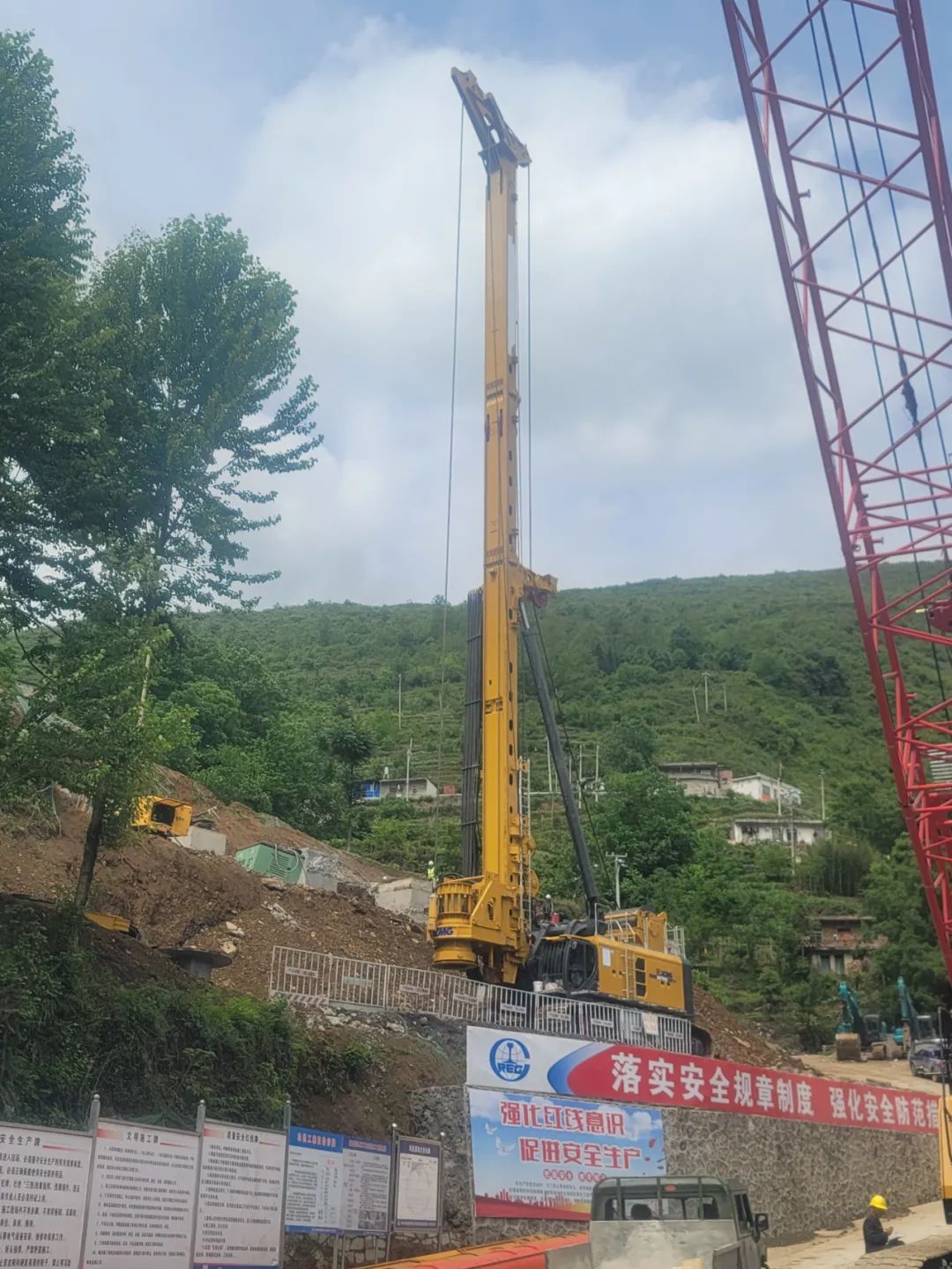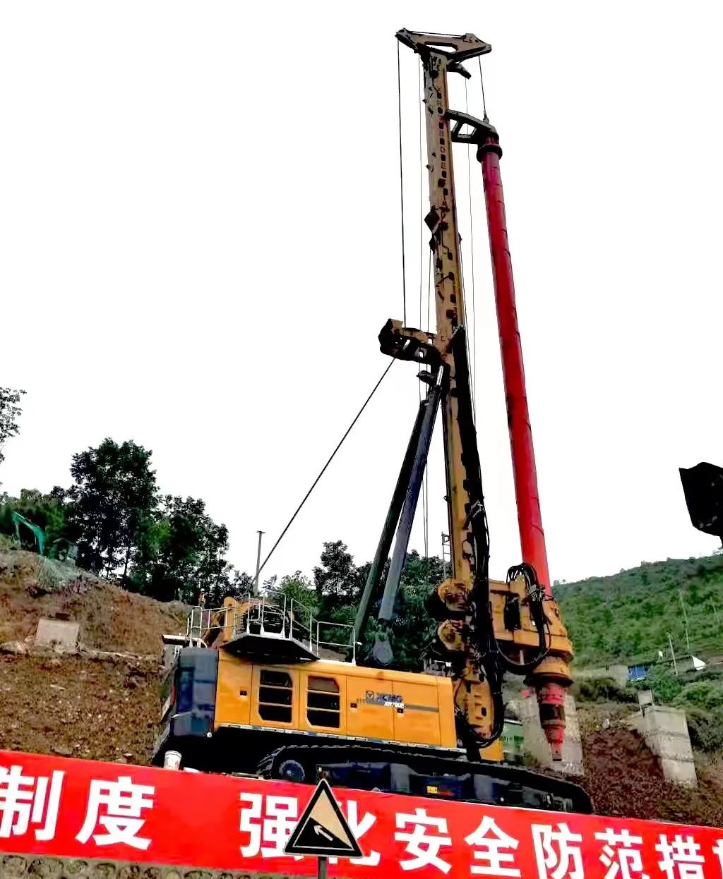 在小龙潭特大桥施工现场,徐工XR780E旋挖钻机运抵工地,升起鹅头后,巍峨耸立像屹立的巨人,坚毅稳重。