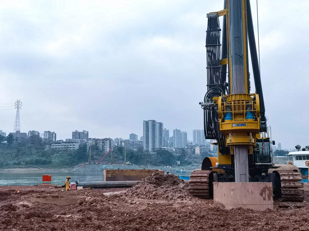 重庆黄桷坪长江大桥桥墩基础工程大桥施工现场,桩基础建设热火朝天。大吨位徐工旋挖钻机机群联合作战,确保桩孔一次成优,在硬岩地质下打出桩径2.5m,平均钻孔深42m的好成绩。