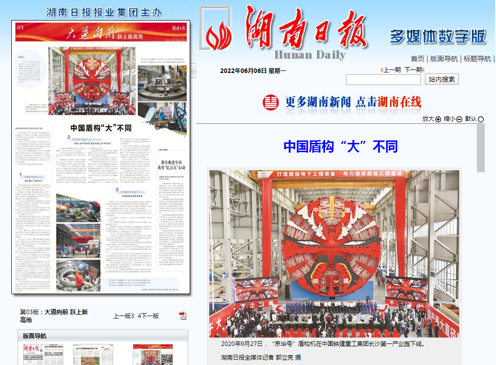 近日,《湖南日报》专题报道铁建重工,讲述以铁建重工为代表的中国制造企业,如何在十多年的时间里,实现中国盾构机从无到有、从弱到强,成就“跟跑、并跑、领跑”三级跨越的精彩逆袭故事。原文如下:
