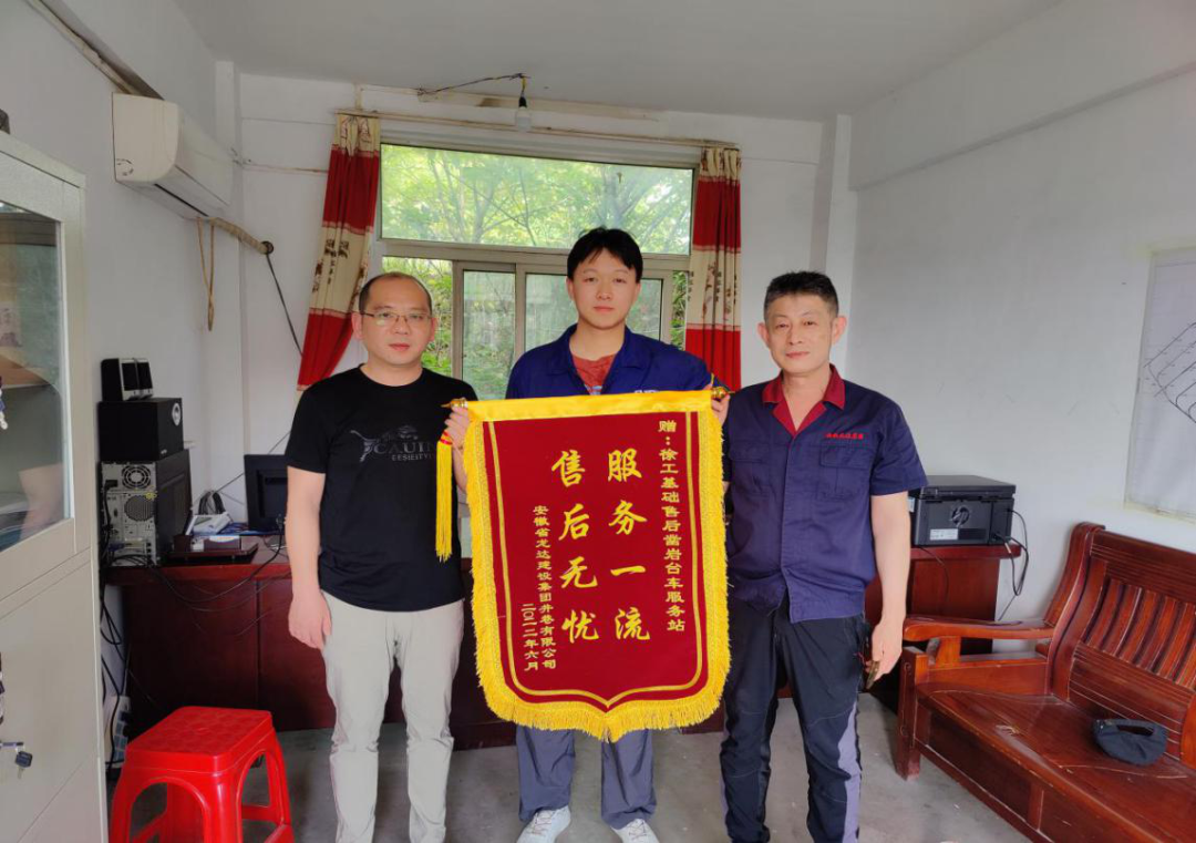 近日,徐工基础收到了一份神秘包裹,是一面印着“服务一流 售后无忧”的鲜红锦旗和一封感谢信:“吴佳承服务一流、及时,工作效率高,任劳任怨、不分昼夜、不惧井下危险作业,极大地保障了我公司的生产效率与产量,用徐工产品让我们真正安心无忧……”