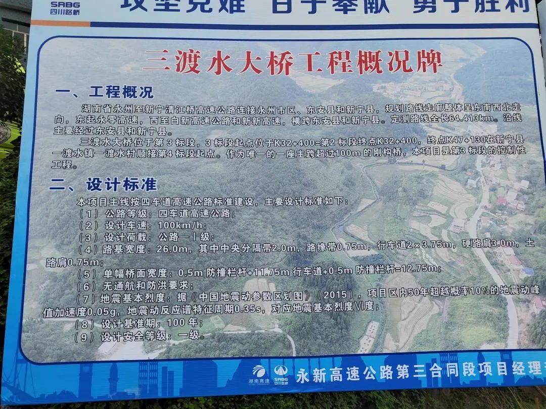 据介绍,此项目位于湖南省永州至新宁清江桥高速公路连接永州市区、东安县和新宁县,规划路线走廊整体呈东南西北走向,东起永零高速,西至白新高速公路和新新高速,横跨东安县和新宁县。定测路线全长64.413km.主要经过东安县和新宁县。三渡水大桥位于第3标段,3 标段起点位于K32+400=第2 标段终点K32+400,终点K47+130在新宁县一渡水镇一渡水村顺接第4 标段起点。作为唯一的一座主跨超过100m 的刚构桥,本项目是第3 标段的控制性工程。