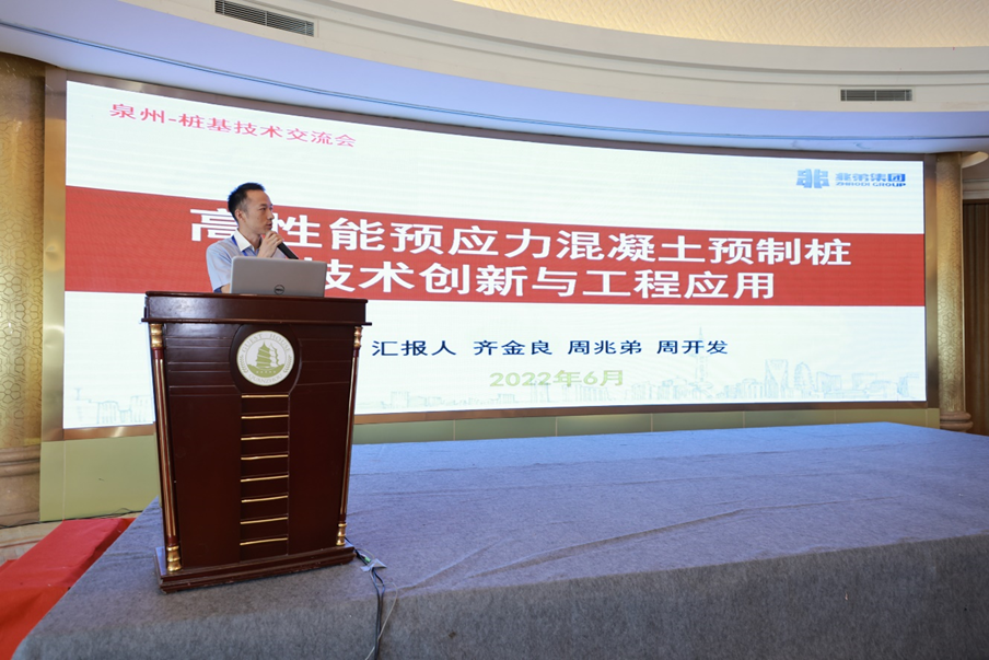 大会分别由兆弟集团副总工程师齐金良、研发中心副主任岳增国博士、兆弟科技总经理张国发博士分别作《高性能预应力混凝土预制桩技术创新与工程应用》、《桩基工程关键技术解读》、《螺锁式连接预应力混凝土方桩工程案例》三个主题报告,从螺锁式连接预应力混凝土方桩的技术特点、研发历程、技术进展、工程应用中的关键技术问题、经济指标分析等方面向与会代表进行了分享。
