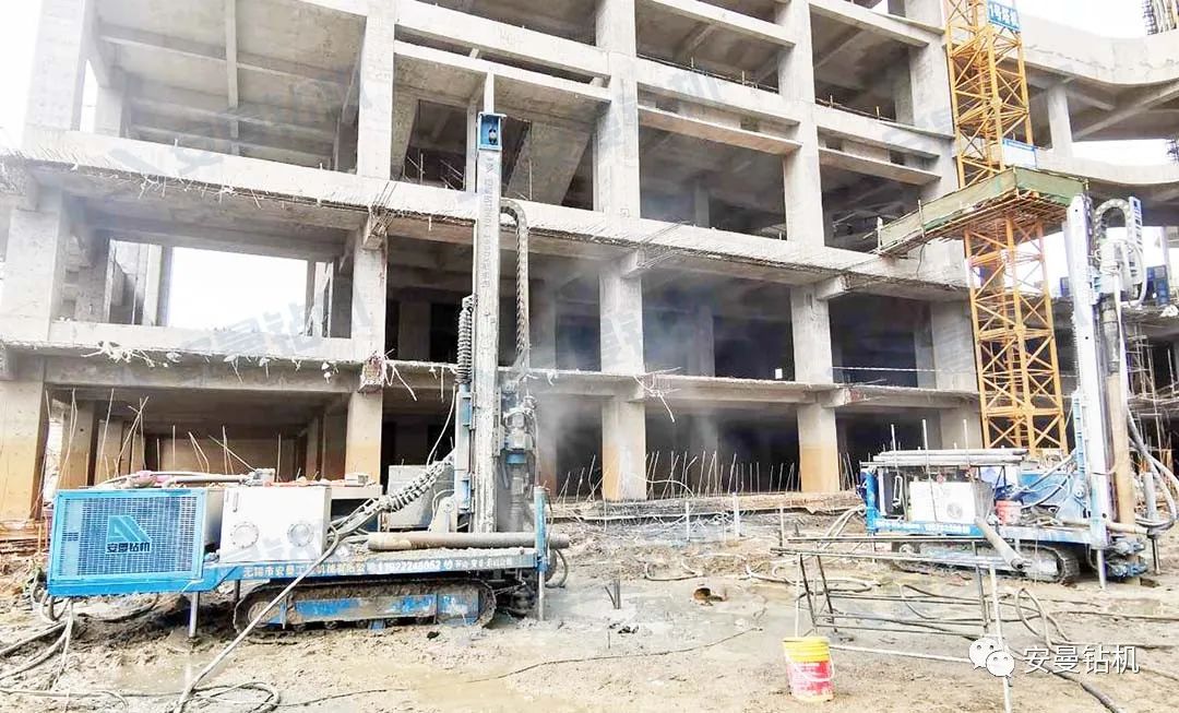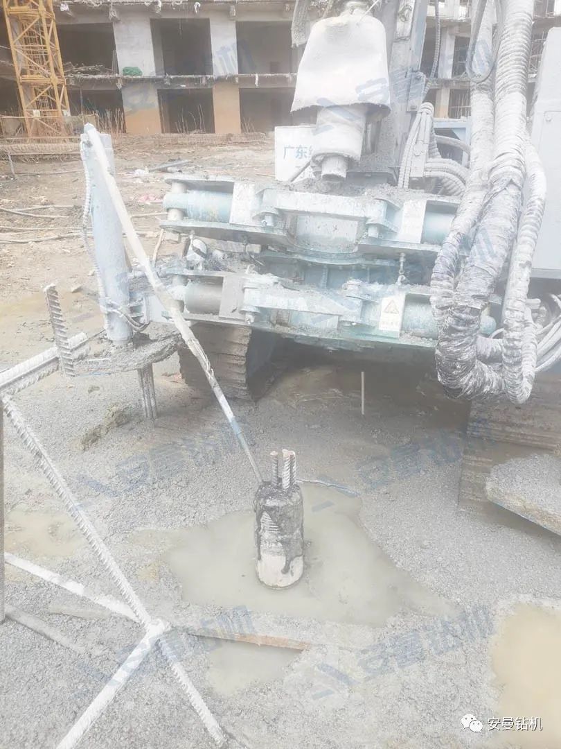 地层结构为纯砂层+花岗岩,套管到岩面封住孔后,用潜孔锤入岩,岩面高度不统一,顶驱钻机双管钻进必须要把双管钻到位后才可以潜孔锤施工,为了节省时间和减少长时间顶部冲击钻进高强度花岗岩,顶驱双管需备用1米和0.5米的钻具。