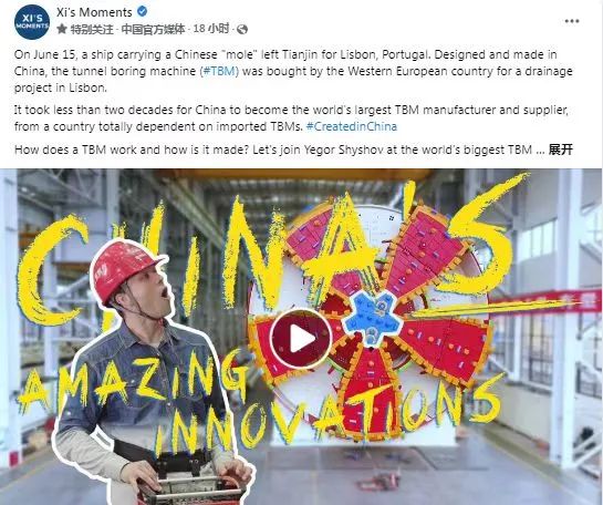 Facebook专页(Xi’s Moments)转发了《让世界惊叹的中国创新:隧道掘进机》专题视频
