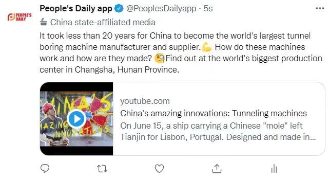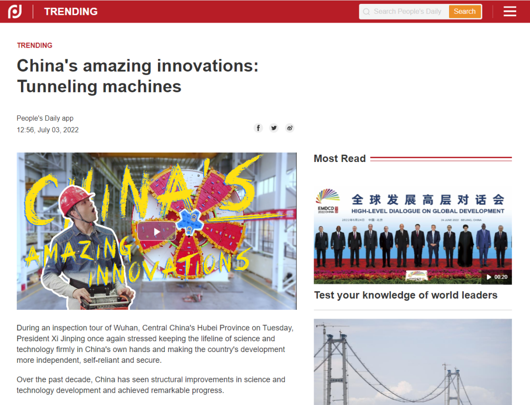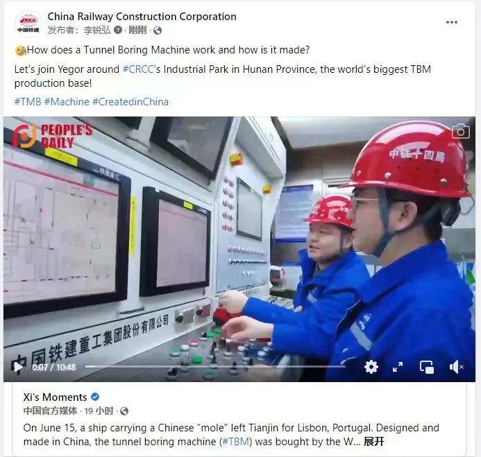 7月3日,人民日报在海外社交平台重磅推出专题视频报道《让世界惊叹的中国创造:隧道掘进机》(China's amazing innovations: Tunneling machines),向全世界推介铁建重工,聚焦盾构机的创新发展,解密大国重器的创新基因。Facebook专页(Xi’s Moments)也转发了专题报道,引起全球观众的强烈关注。