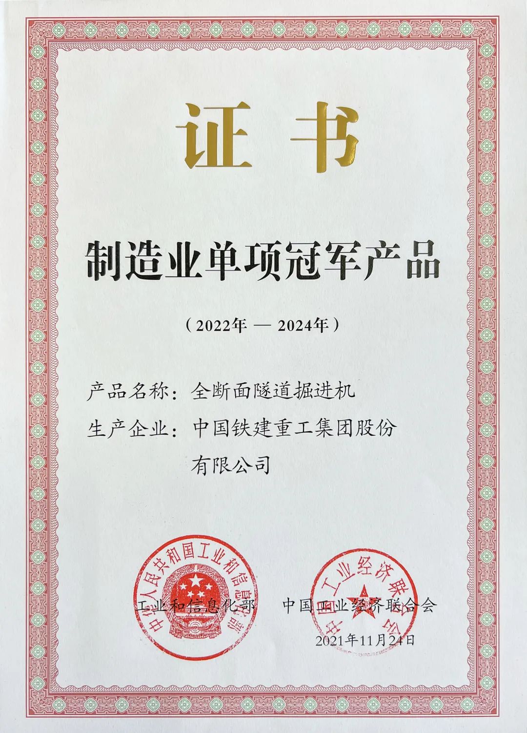 近日,国家工信部、中国工业经济联合会颁发了第三届制造业单项冠军产品复核通过的新证书。作为2019-2021年的单项冠军产品,铁建重工全断面隧道掘进机经过行业和市场的三年考验,成功获批继续保持这一行业冠军殊荣。这也代表着铁建重工在全断面隧道掘进机这一细分产品领域持续稳居市场和技术全球前列,彰显“中国制造”排头兵的强劲实力。