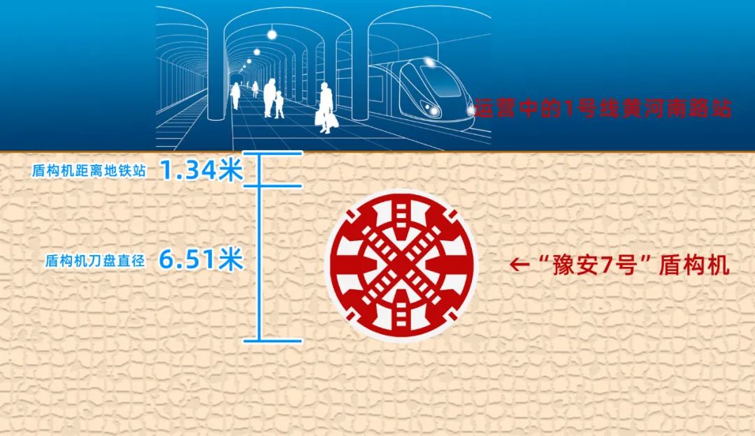 该项目总计涉及17项风险源,其中下穿地铁5号线区间隧道、1号线黄河南路站属于一级风险源(最高等级),施工难度极大。盾构机刀盘距离地铁1号线黄河南路站垂直距离仅有1.34米,地层为全断面富水砂层,沉降控制压力大,这样复杂地层中超近距离下穿既有线车站极为罕见。