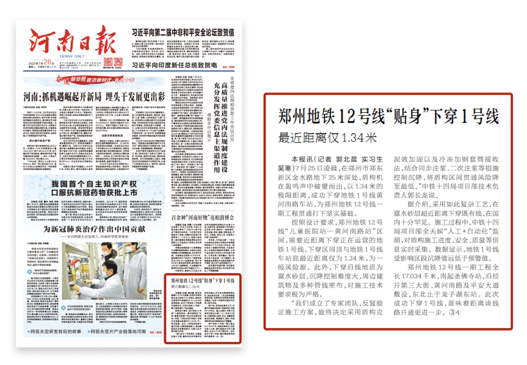 7月25日凌晨,由中铁十四局承建的郑州地铁12号线一期工程“豫安号”盾构机完成掘进任务,顺利下穿郑州地铁1号线、5号线两大风险源,其中下穿1号线黄河南路车站属于超近距离下穿既有线车站,施工难度国内罕见。同时也意味着12号线黄河南路站~儿童医院站~祭城东桥站~胡庄站三段区间隧道双线贯通。
