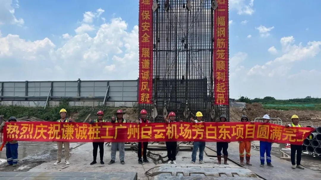 7月23日,大暑已至,烈日炎炎。随着最后一副GADLQ22地连墙的顺利起吊,谦诚桩工承建广州白云机场T3轨道交通预留工程芳白东项目圆满收官。总包方中铁隧道股份有限公司白云机场T3轨道交通预留工程项目经理部常务副经理张磊、总经济师王亚琼、副总工赵长青等领导到场祝贺,项目经理张瑞携芳白东项目团队全体成员参加完工仪式。