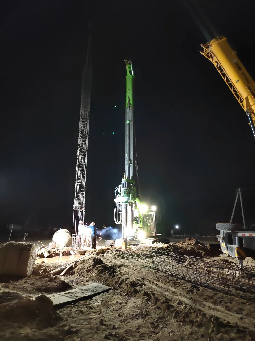 为了完成公司下达的一天单机5根桩的任务指标,在完成白天的户外作业任务后,夜晚继续架起照明灯,加班加点,直到圆满完成当天任务。
