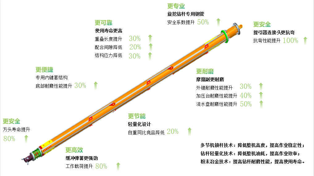 ☆各节钻杆重叠长度更长、配合间隙更小,钻杆成孔精度更高,钻杆压杆稳定性更好, 改善钻杆下端管体受力,施工时,稳定性更好,降低整机抖动;