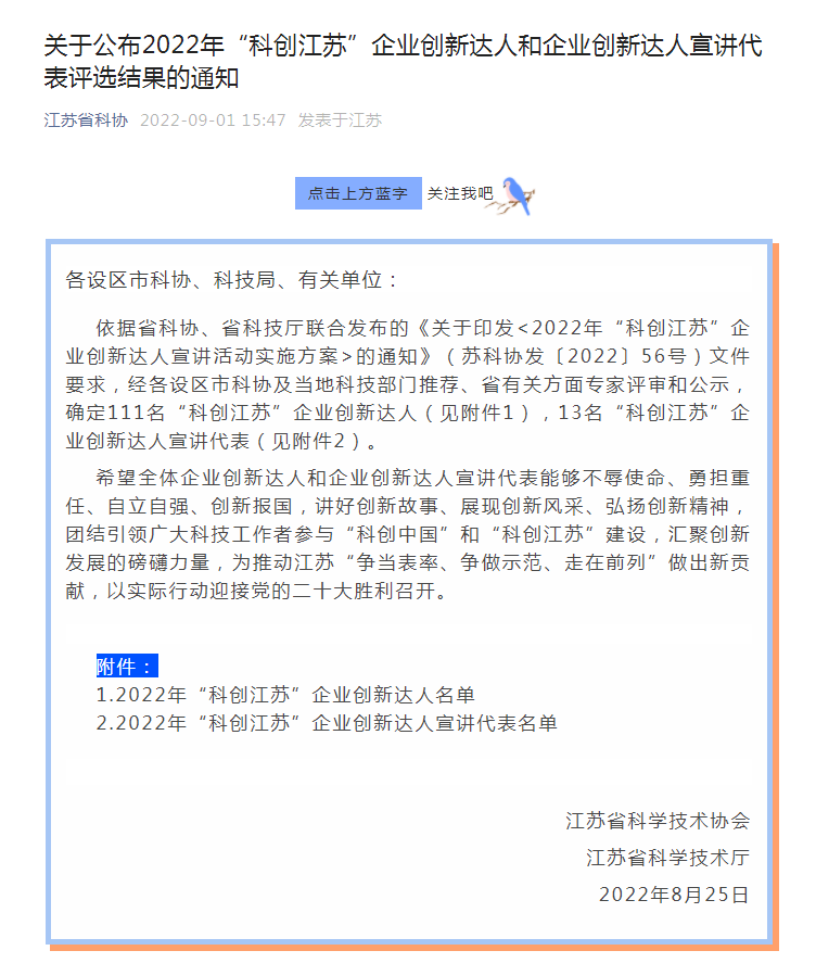 “科创江苏”企业创新达人评选由江苏省科协、省科技厅共同组织,面向广大企业一线科技工作者,挖掘宣讲企业科技工作者创新争先、奋斗报国感人事迹,重点是在科学研究、技术应用、科技推广、技术创新、成果转化等工作中取得优异成绩、具有示范意义的典型人物,经各县市科协会同当地科技部门层层选拔,省科协、科技厅组织专家评审而最终确定,全省111人入选。