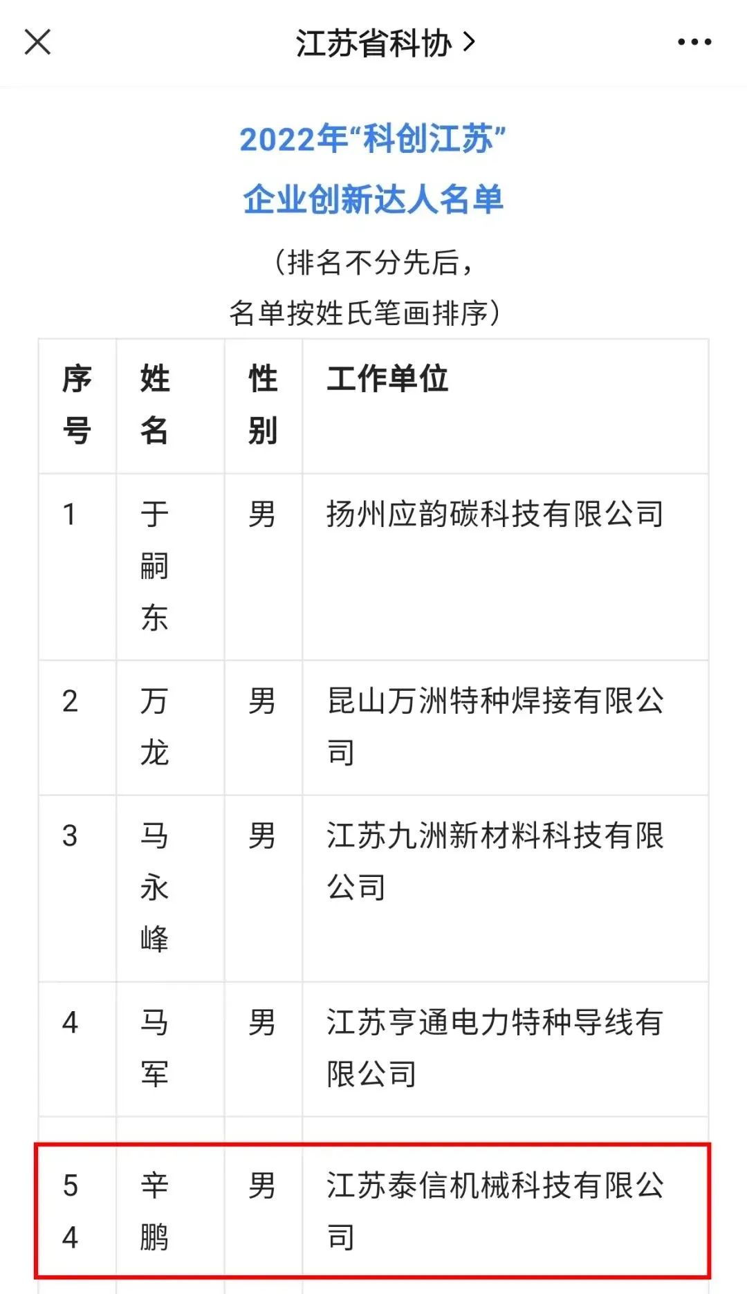 近期,江苏省科协公布《2022年“科创江苏”企业创新达人和企业创新达人宣讲代表评选结果的通知》,江苏泰信机械科技有限公司董事长辛鹏,入选2022年“科创江苏”企业创新达人。
