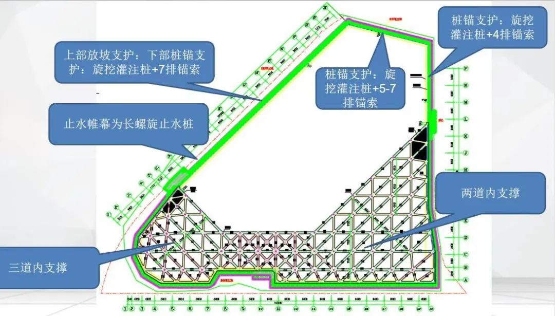 为保证项目的顺利实施,云南建投基础公司抽调精兵强将组成项目团队,公司领导、生产安全技术部门赴现场提供组织保障、技术指导,经过多种工艺对比,最终确定了采用目前国内较先进的工艺——“桩锚支护+三道混凝土内支撑”的技术——基坑四周止水支护桩围打一圈,建造一个“钢铁侠”牢牢撑起整个深基坑,保护建筑安全。