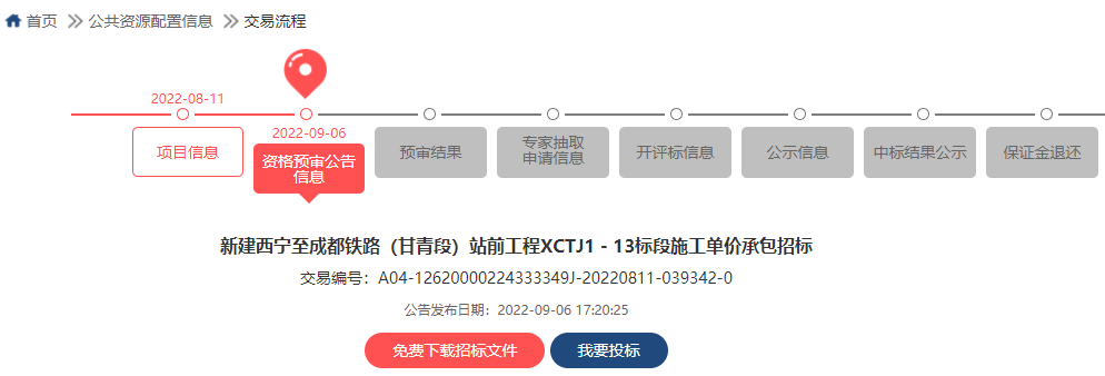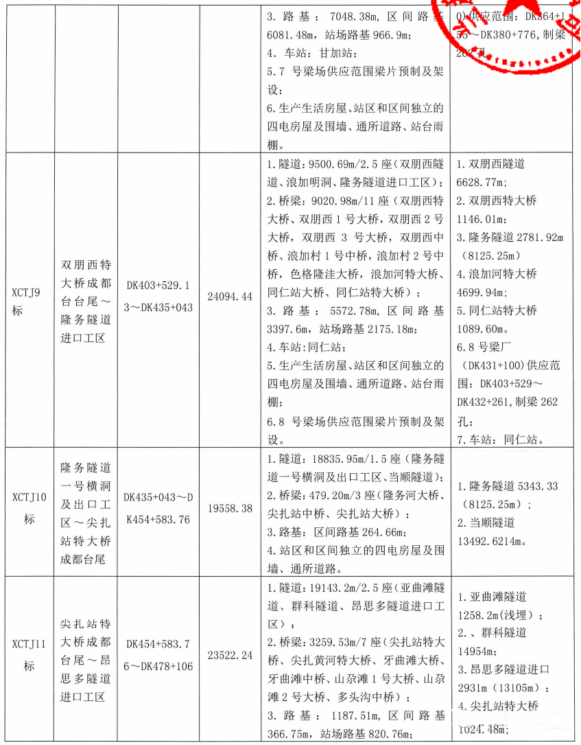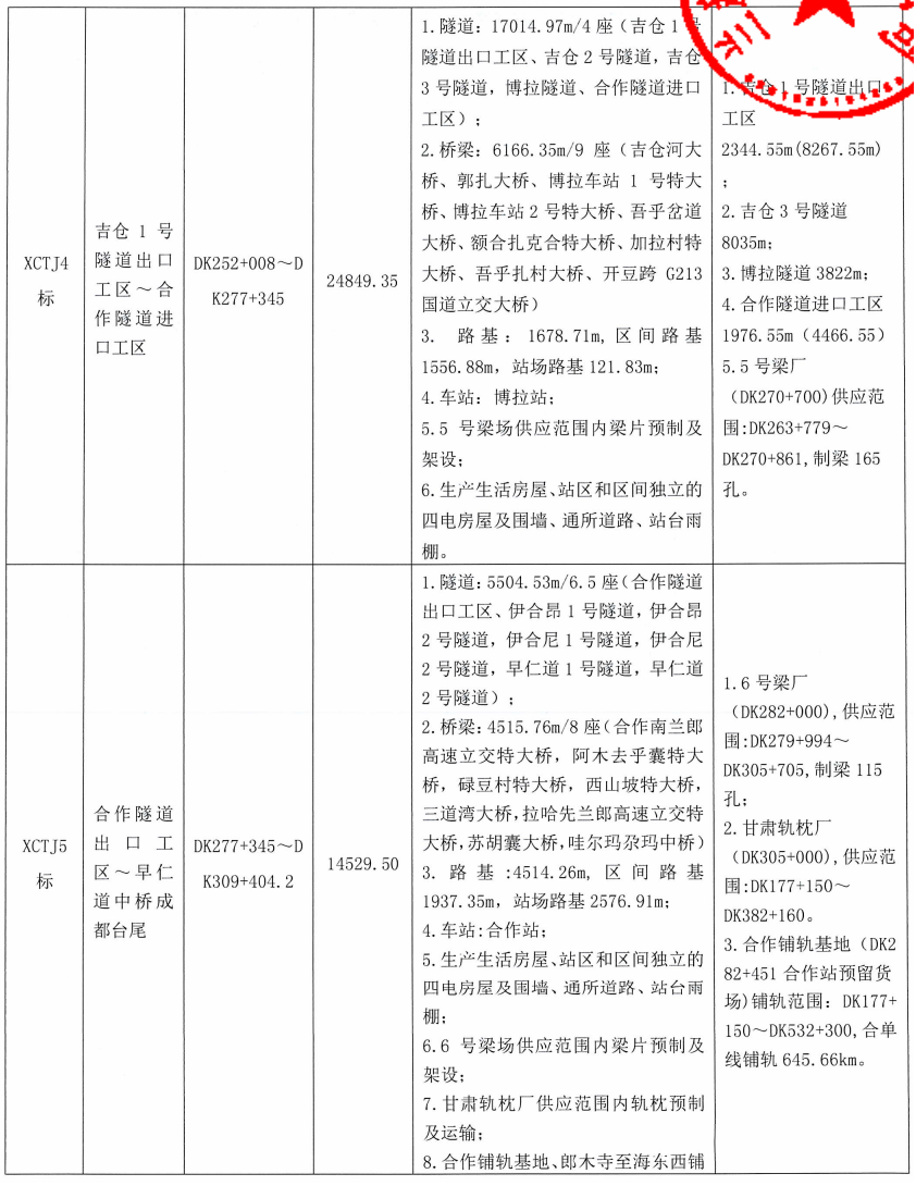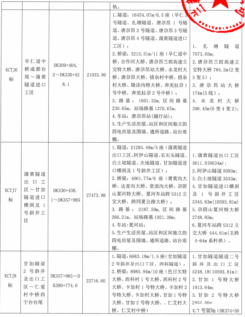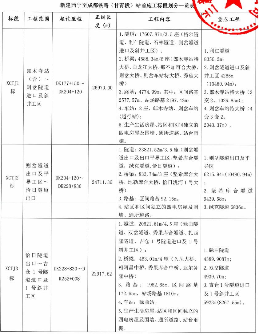 本次招标共划分为13个标段(甘肃省境内8个标段, XCTJ1 标约3.9km位于四川省境内;青海省境内5个标段),不含先期开工的甘青隧道和引入海东西工程,标段编号为XCTJ1~13。具体见《新建西宁至成都铁路(甘青段)站前施工标段划分一览表》。