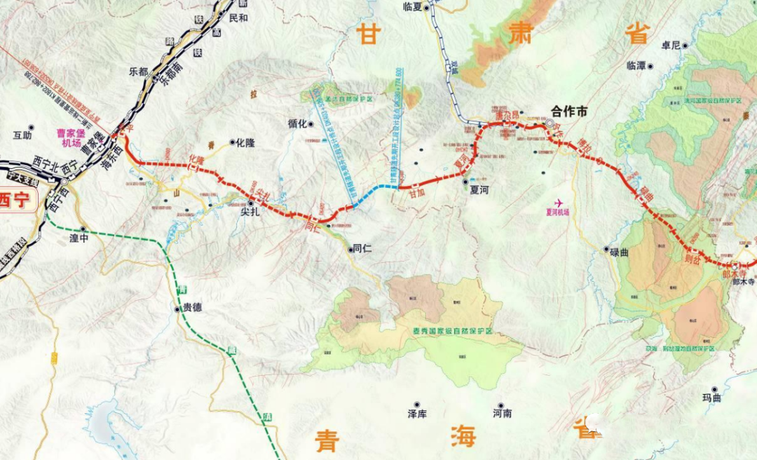 线路自青海省西宁枢纽海东西站引出,经海东市、黄南州进入甘肃省甘南州夏河县、合作市、碌曲县,随后进入四川省境内,经若尔盖县、松潘县后接入在建成兰铁路黄胜关站。
