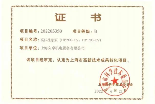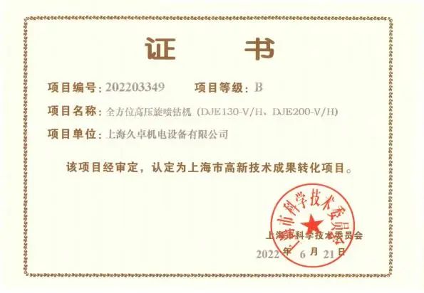 近日,上海公布了《2022年第3批上海市高新技术成果转化项目》,该评选旨在贯彻落实《上海市促进科技成果转化条例》《上海市推进科技创新中心建设条例》等法规政策的精神,强化企业自主创新能力,促进科技成果转化,培育创新发展新动能,上海久卓凭借“高压注浆泵”,“全方位高压旋喷钻机”2项高新技术成功入选。