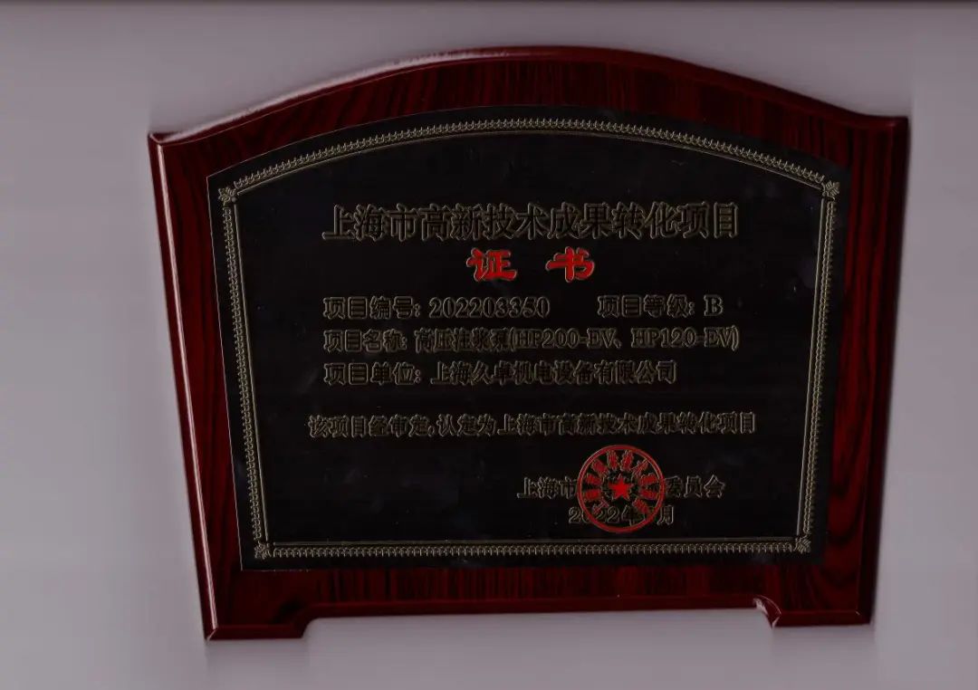 上海市高新技术成果转化项目-高压注浆泵证书与奖牌