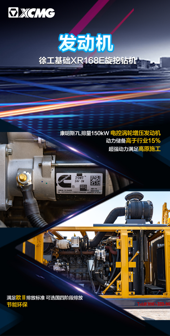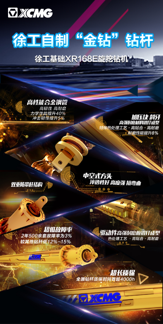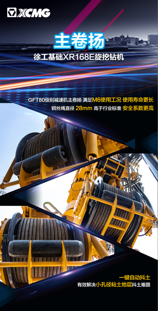 XR168E旋挖钻机是徐工基础新推出的E系列小吨位产品,采用双动臂大平行四边形变幅机构,支撑角度大,支撑范围增加24%,作业更稳定;发动机动力强劲,油品适应性更高;液压主系统采用大排量主泵配低转速发动机,油耗更低,效率更高……