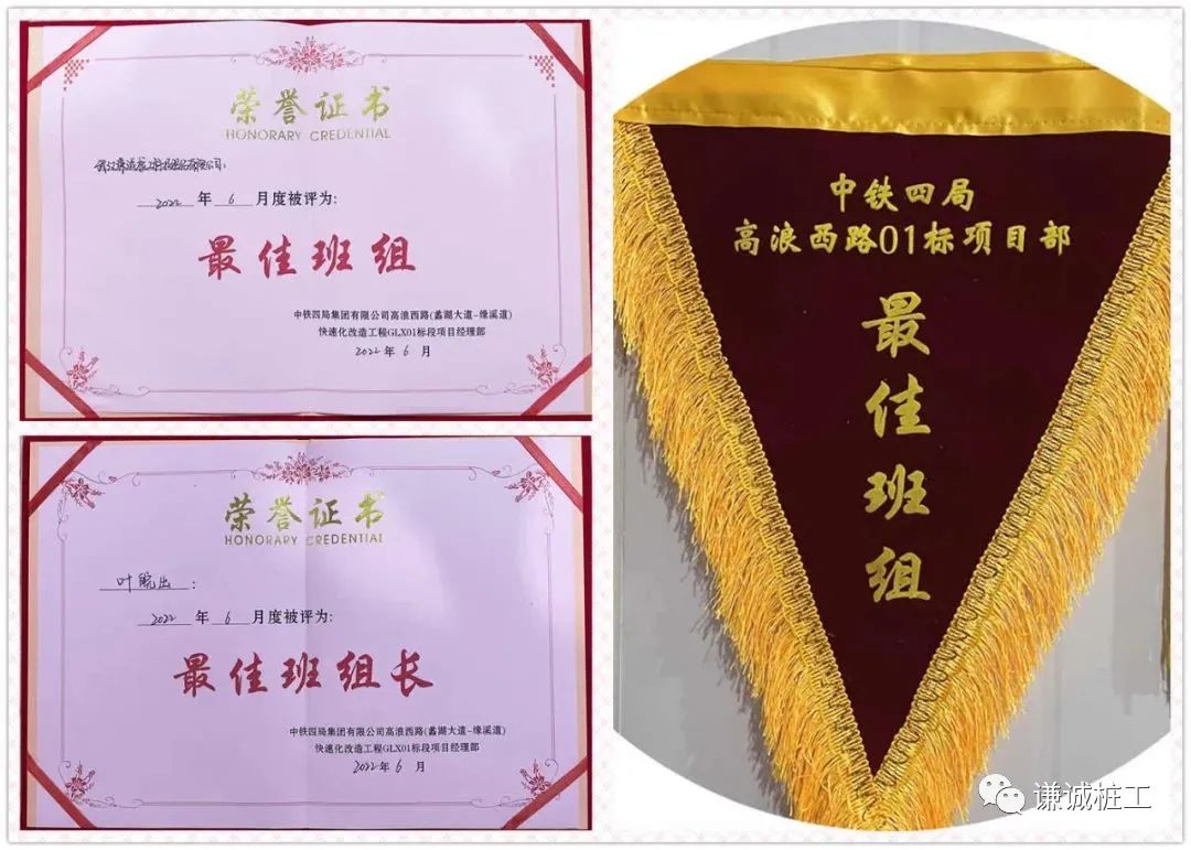 项目自5月28日接到中铁四局中标通知书,至6月10日仅用了13天时间就完成各项开工前准备工作,推动项目如期开工,展示了“来之能战 战必能胜”的谦诚速度,得到总包方领导的高度赞扬。自开工以来,谦诚桩工项目团队在项目经理胡品胜的带领下,上下一心、攻坚克难,一方面充分利用现有施工条件,加速推动施工进度;一方面积极与总包方沟通管线改迁及后续工作面安排,提前做好下一步施工准备工作,以期最大限度地缩短项目工期、提高工作效率、保证施工进度,全力以赴的保障项目建设的有序进行,更得到了总包方的高度认可和大力支持。在总包方组织的6月份“三佳一星”表彰大会上,项目团队获评“最佳班组”,项目总工叶皖出获评“最佳班组长”。