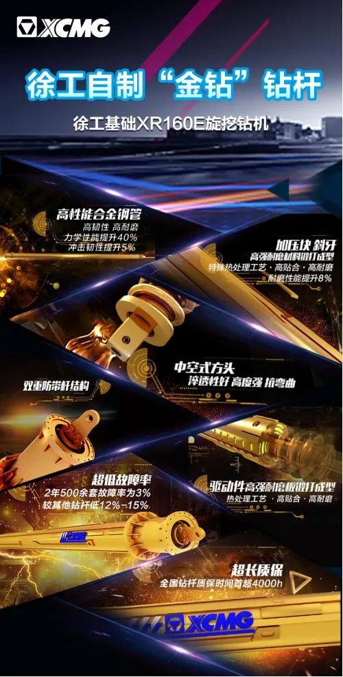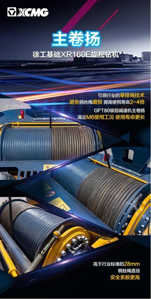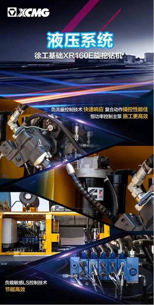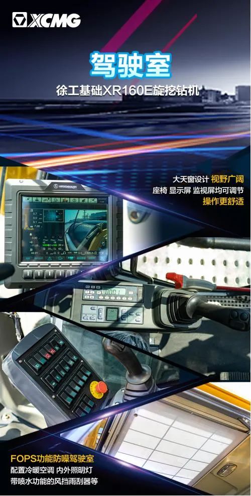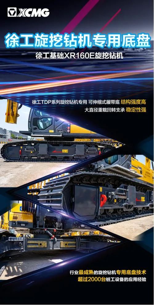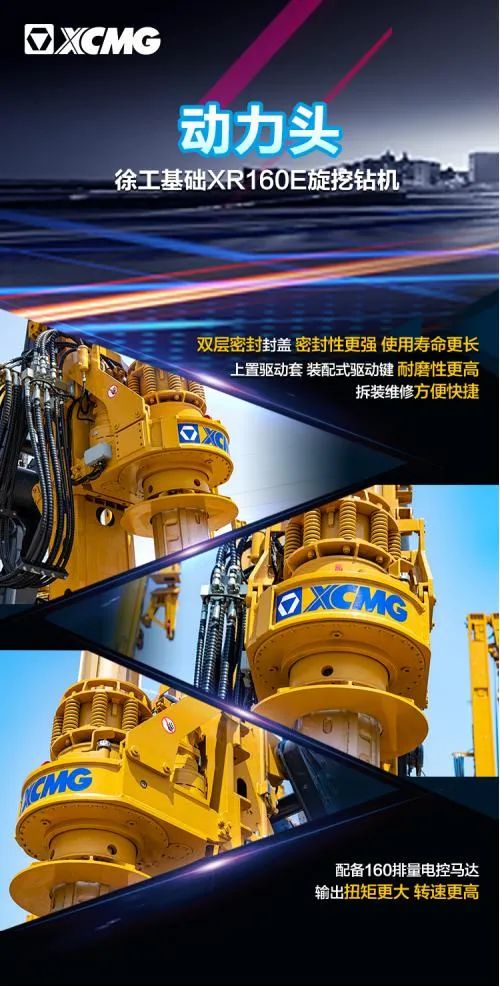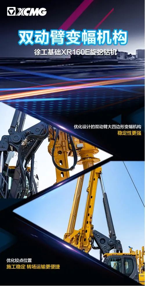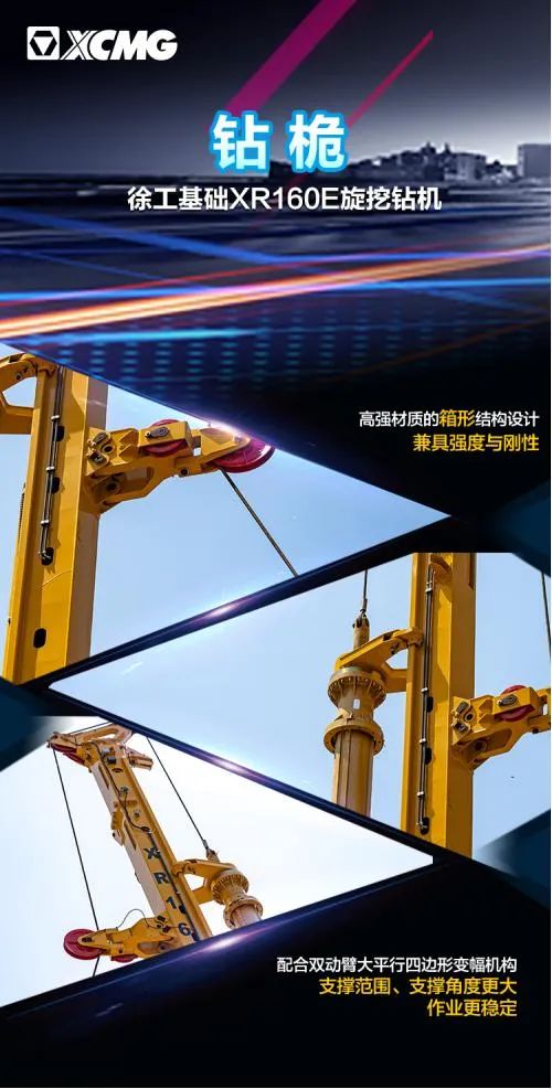 XR160E旋挖钻机是徐工基础新推出的E系列小吨位产品,动力头最大输出扭矩可达160kN·m,转速可达35r/min,作业效率更高;采用双动臂大平行四边形变幅机构,支撑角度大,支撑范围增加24%,作业更稳定;智能控制系统实现钻桅垂直度自动调节与显示、自动回转、自动甩土等功能。