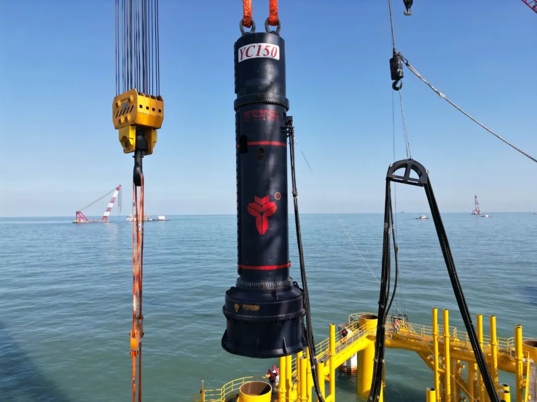 国华渤中B2场址海上风电项目是三航局与国家能源集团在山东合作的首个海上风电项目,该项目主要建设59台海上风机、1座海上升压站、35kV场内集电海缆、220kV送出海缆和陆上集控中心等工程。永安机械YC-150圆形海工液压冲击锤在本次项目中施工,日夜奋战,打桩时间50余小时,共击锤15000余次,最终把4根直径2.4米,长98.8米的钢管桩打入地下80多米,圆满完成了本次打桩任务,国产海工打桩锤的高可靠性和永安人的敬业精神得到了项目部的一致好评!