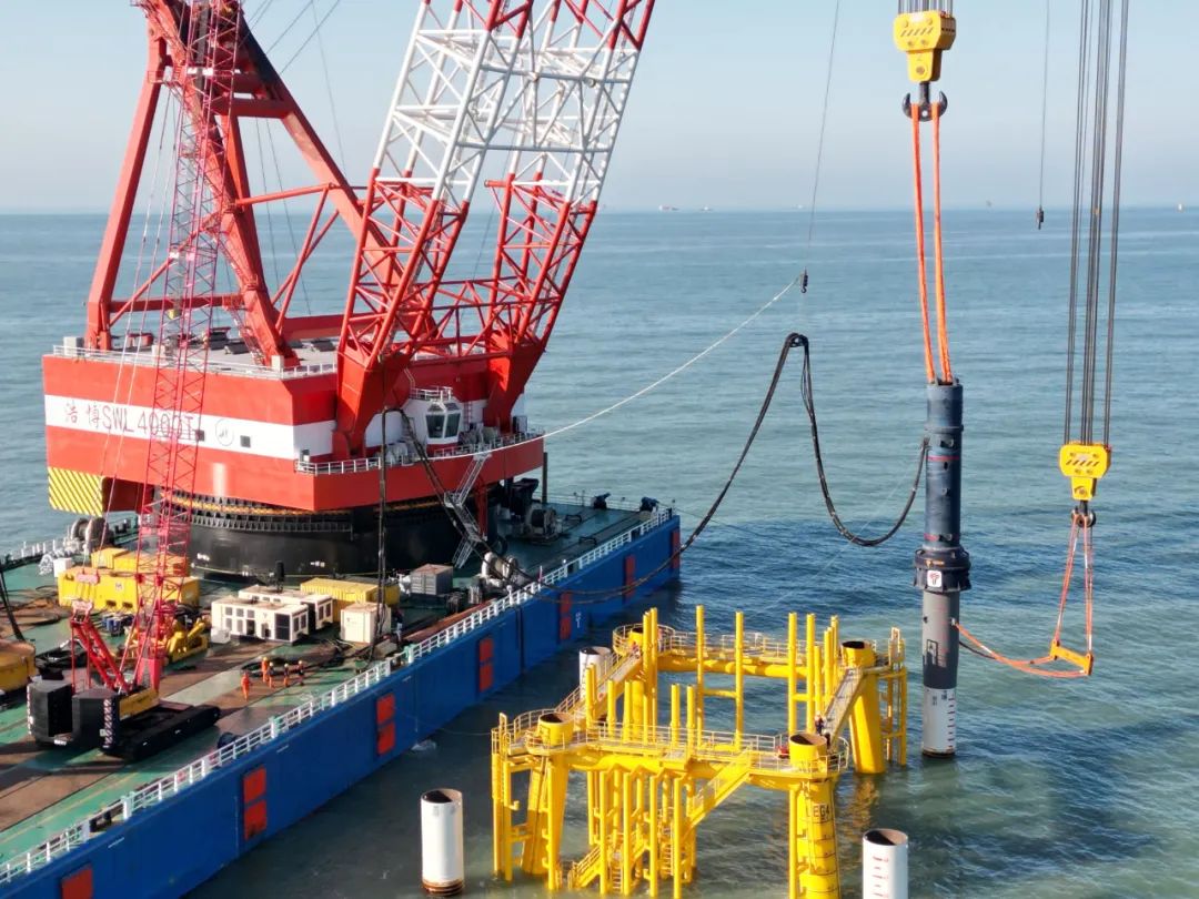 海上升压站基础施工是项目最关键的节点目标之一,本基础采用裙桩套管式四桩导管架结构型式,地质情况为粉质黏土,粉砂层。承接本次施工的为华西村海洋工程服务有限公司。为确保单桩高质量、高效率施工,永安机械多次与华西海工进行选型商讨,方案论证,并最终选择了永安机械YC-150圆形海工液压打桩锤,为完成沉桩工作和该风电场的建设打下了坚实的基础。