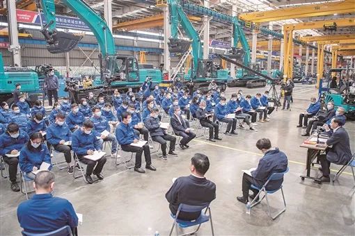 智能化的生产线开启效率变革,新下线的挖掘机即将奔赴远方……火热的车间成为学习党的二十大精神的“课堂”,长沙工程机械企业代表、长沙经开区负责同志以及70余名山河智能职工代表聚精会神,边学边记。