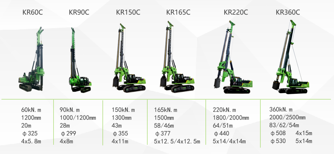 KR250CS低净空旋挖钻机最大钻孔深度33m,最大钻孔直径2m,最大输出扭矩250kN.m,整机重量62吨。