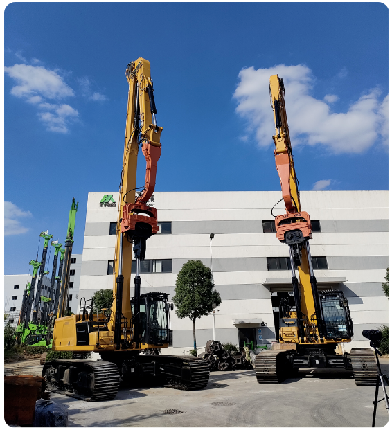 泰信机械卡特彼勒底盘打拔机又称超长专用打桩臂,该设备适用于围堰、堤坝、沟渠、防土墙、斜坡面等基础工程施工,可打拔钢板桩、水泥桩、钢轨桩、H钢板等。该设备打拔高度更高,大小臂打开的夹角更大,只需配套专用打桩锤即可轻松实现打拔12~20米等长度的钢桩,使沉桩、拔桩更加方便灵活。