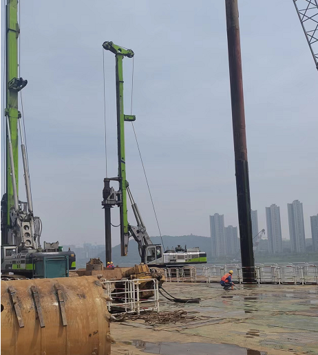 现场有多台中联重科旋挖钻机ZR280C-2助力施工,其桩径800-1500毫米,深度32米,有开孔入岩,部分桩孔入岩3-4米,硬度约40兆帕。使用截齿捞沙斗。整个桥梁基本都是中联重科设备施工,客户大多来自联盟客户设备租赁。从去年9月开工以来,一直备受好评,“中联的旋挖一直都很稳,打土快、油耗也低!”