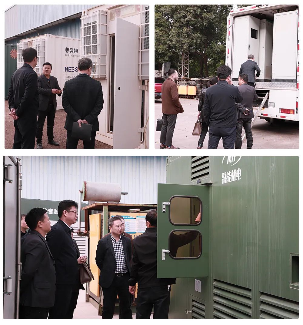 技术副总陈欣然及营销副总李东喜在生产基地现场为许洺鑫董事长等考察团成员详细介绍了聚能优电NDES500柴储发电机组,NESS500风光储纯储能箱等自主研发生产的"黑科技,低碳节能"系列产品实时操作与场景应用。
