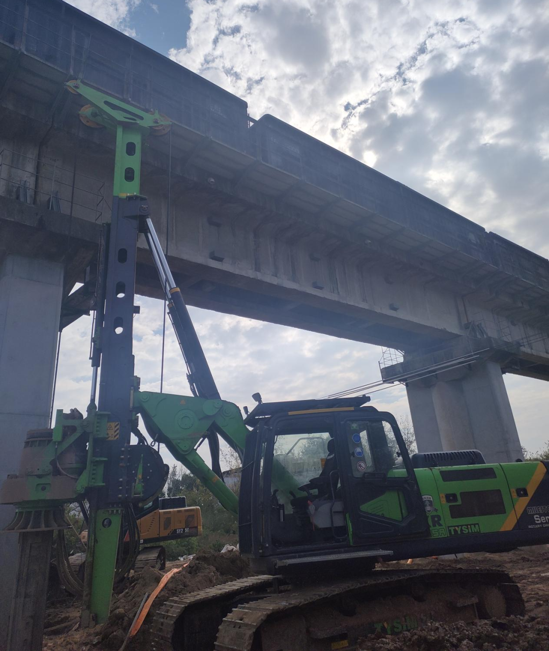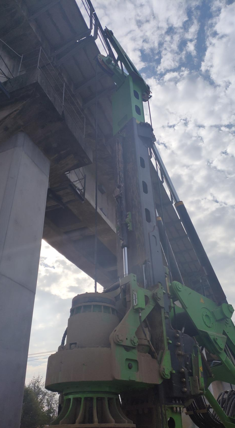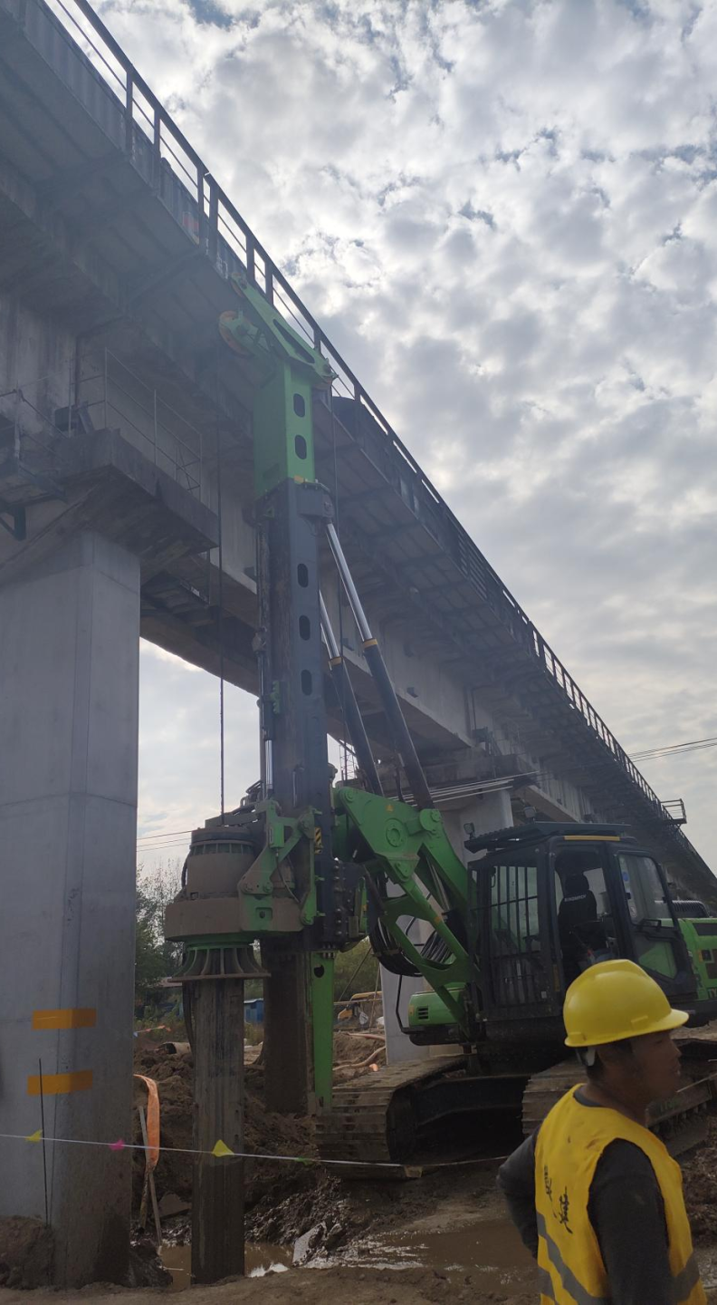 该项目毗邻正在运营的高铁线路,要求施工设备高度不超9米,桥墩下有高压电线和爬梯,最近处距离爬梯仅10cm,对机器施工高度要求非常严格。现场施工桩径800mm,孔深约15m。地层地质主要为回填层、粉砂层、粉土层、中风化红砂岩,红纱岩的强度达到35MPa,需要设备具备较强动力及入岩能力,施工过程中存在塌孔风险,一旦塌孔会引起地面沉降,影响正在运营的高速铁路,施工难度极大。泰恒基础本着专业、及时、周到的服务,以客户为中心,凭借专业的业务素质,配合先进的施工工艺,为客户高效、高质量的完成了施工任务。
