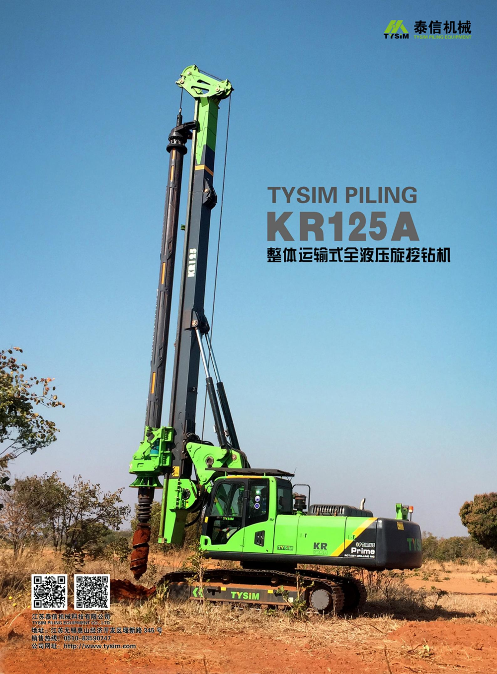泰信KR125A旋挖钻机,整机重量35吨,施工直径范围0.4~1.5米,施工高度15米,具备整体带杆运输,自动折叠桅杆功能,降低运输高度的同时减少运输途中的拆装时间。原装进口行走减速机及马达使得设备具备良好的爬坡性能;同时12.5吨米的动力头扭矩也完全能应付大多数的鹅卵石、砾石等地质情况。精选动力强劲的原装美国康明斯发动机,配合泰信核心技术的电控系统和液压系统,更充分发挥其工作能力,全系列产品通过国标GB认证及欧盟CE认证,更佳的动态及静态稳定性设计,保证施工安全。