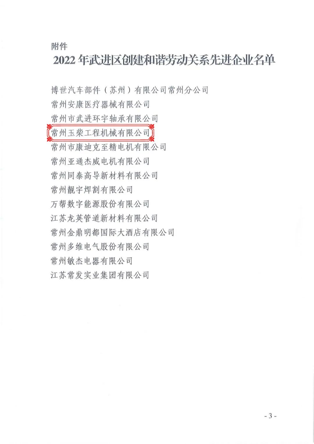 日前,常州市武进区协调劳动关系三方委员会发文,公布了武进区和谐劳动关系先进企业名单,常州玉柴成功入选,获得“武进区和谐劳动关系先进企业”称号。