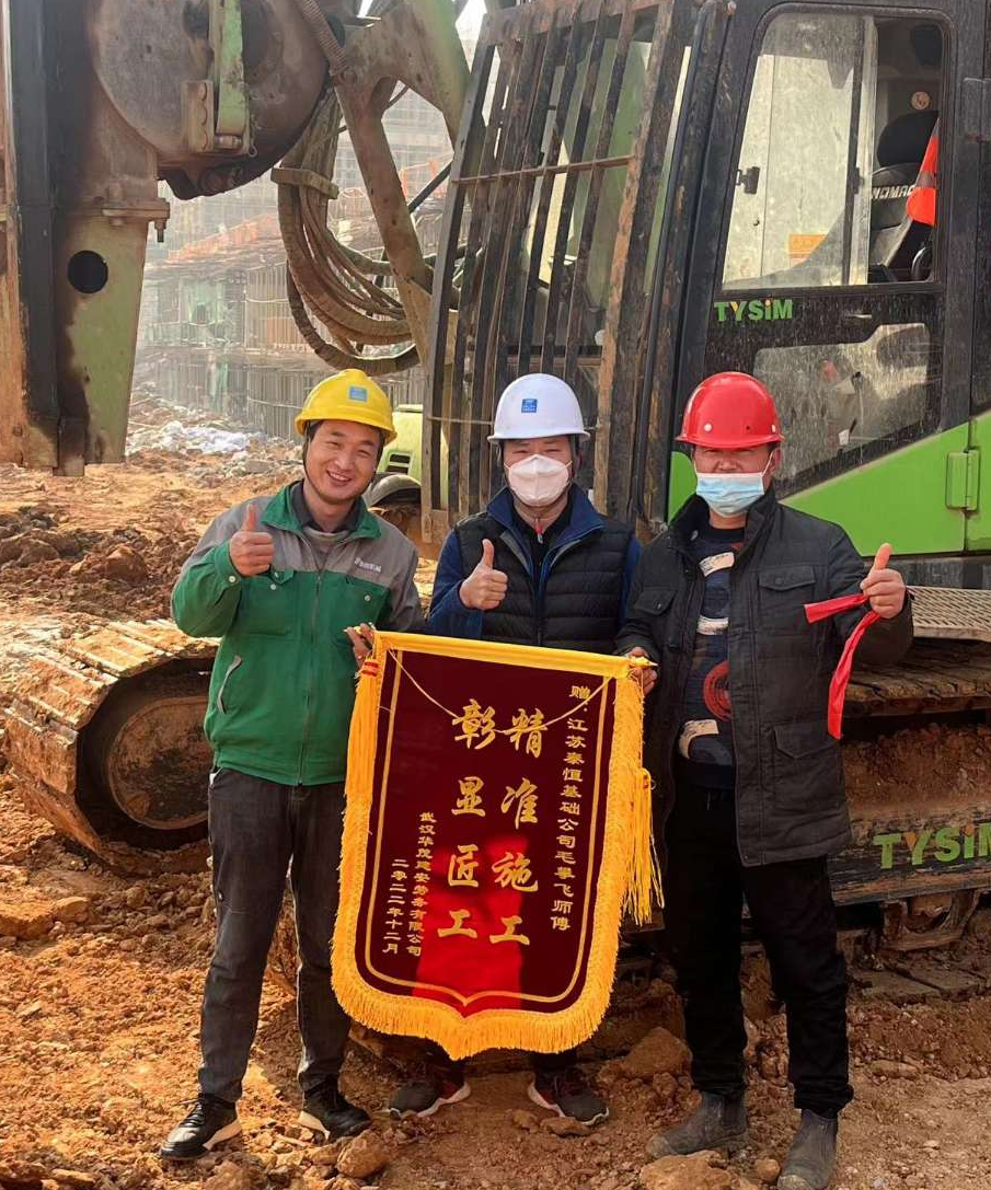近日,泰恒基础参建的武汉盘龙云海城施工项目桩基部分即将完工,其施工效率获得了当地地区施工单位的关注。项目部代表为现场泰恒基础机手送来了写有“精准施工、彰显匠工”的锦旗,施工现场KR125A小型旋挖钻机高效完成了施工任务,优异施工工艺工法获得了现场管理和总包方的一致好评。