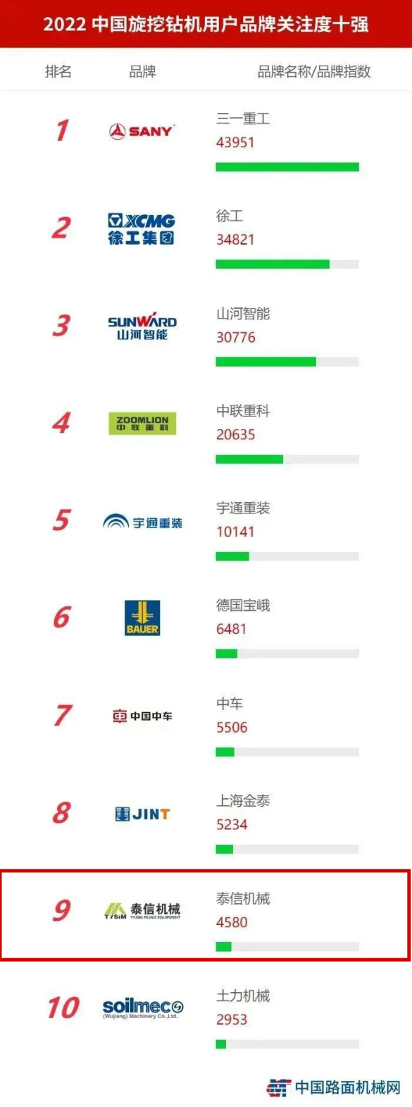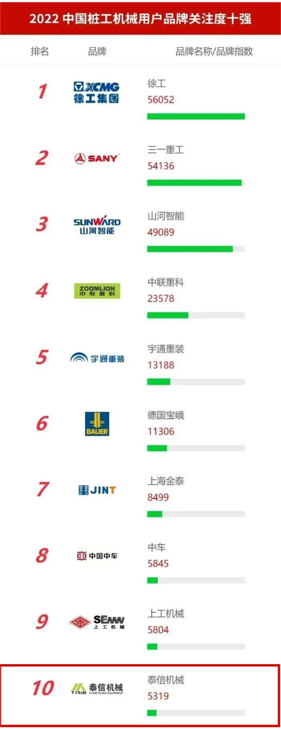 近日,“2022年中国工程机械用户品牌关注度排行榜”在京发布。泰信机械凭借全国客户的高关注度,入选为“2022中国桩工用户品牌关注度十强”榜单,这也是泰信机械连续七年跻身该榜单。