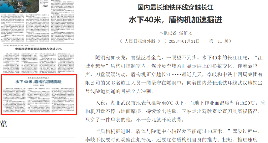 人民日报海外版以《水下40米,盾构机加速掘进》为题,对中铁十四局武汉地铁12号线盾构隧道施工进行了报道。春节期间,该项目建设者坚守在长江下40米的盾构隧道施工现场,向着国内最长地铁环线武汉地铁12号线隧道贯通的目标全力冲刺。