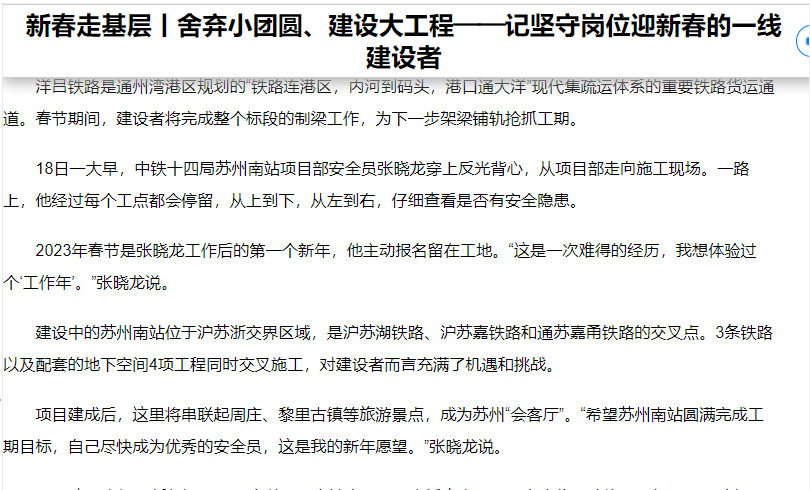 春节期间,中铁十四局苏州南站项目部施工不打烊,部分职工和施工班组坚守在工地一线,4个项目同时施工,现场一片热火朝天的大干场景,新华社以《舍弃小团圆、建设大工程——记坚守岗位迎新春的一线建设者》为题对此进行了报道。
