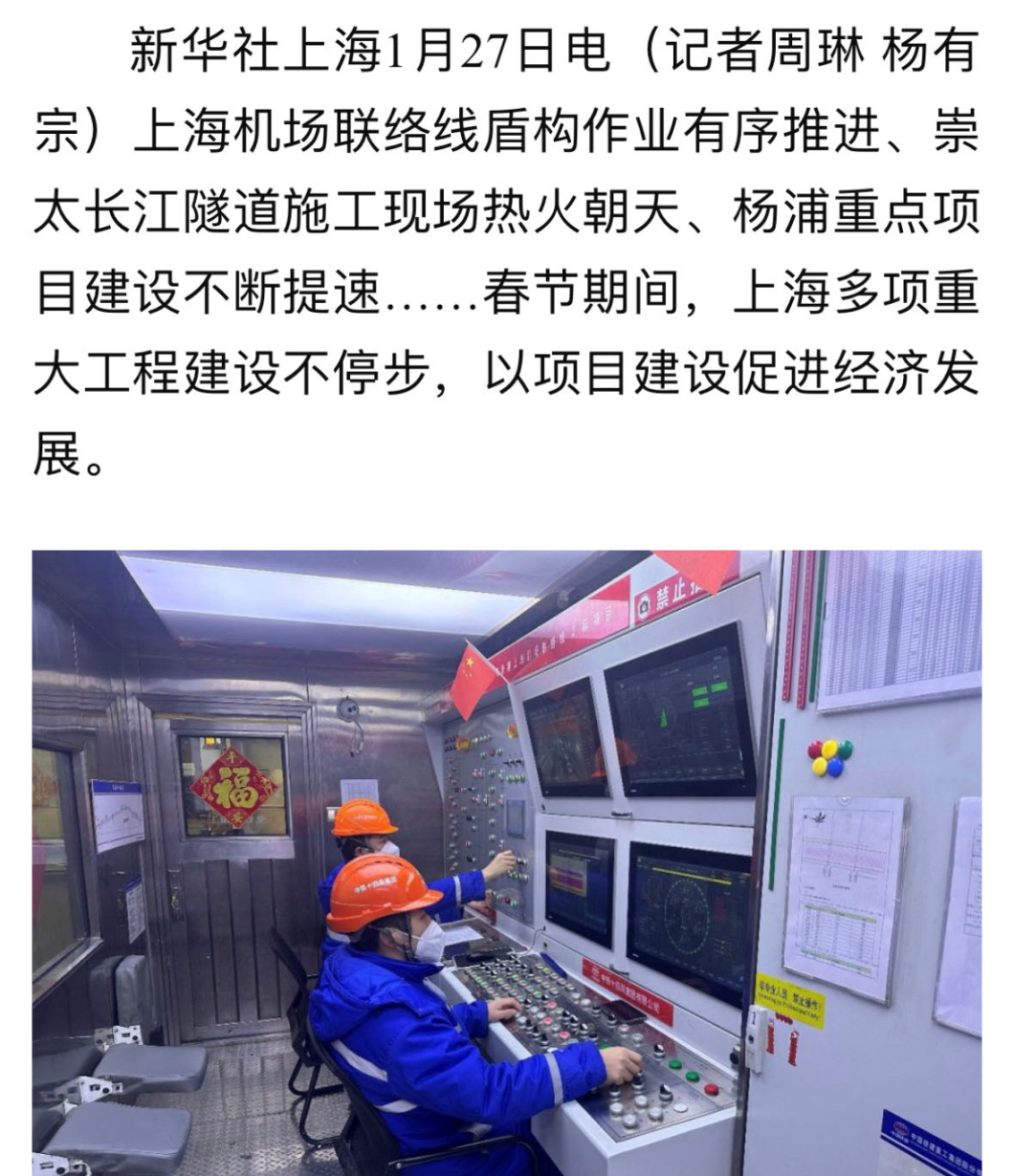 春节期间,上海多项重大工程建设不停步,以项目建设促进经济发展,在中铁十四局上海机场联络线2标盾构隧道施工现场,120名建设者奋战项目现场,稳步推进工程建设。新华社以《冲!工程动起来,创新热起来,早春抢出来》进行了报道。