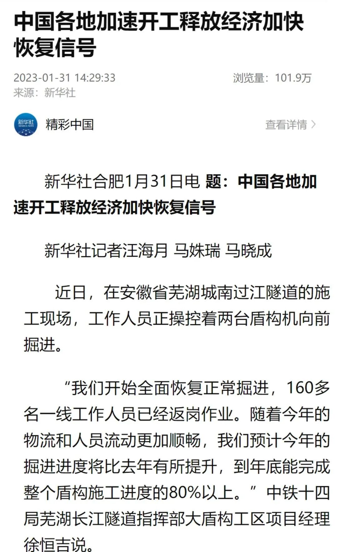 1月31日,新华社以《中国各地加速开工释放经济加快恢复信号》为题推出报道,对春节假期后中国快速进入复工复产的节奏进行了报道。文章聚焦芜湖长江隧道项目,目前,该项目开始全面恢复正常掘进,160多名一线工作人员已经返岗作业,随着今年的物流和人员流动更加顺畅,预计今年的掘进进度将比去年有所提升,到年底能完成整个盾构施工进度的80%以上。