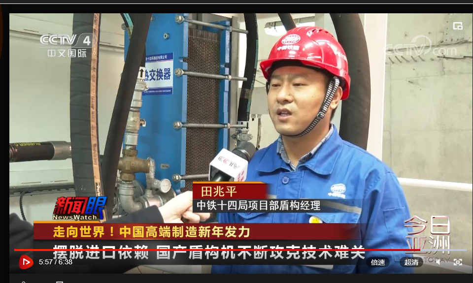 中央电视台CCTV-4中文国际频道《今日亚洲》栏目聚焦中国制造,《走向世界!中国高端制造新年发力》聚焦中铁十四局北京东六环项目“京华号”盾构机、广州海珠湾隧道项目“大道先锋号”盾构机。近年来,中铁十四局结合多年穿江越海盾构施工的丰富经验,针对工程难点,联合设备制造商对盾构机进行量身定制,广泛应用创新技术,以应对复杂工况下的工程风险。