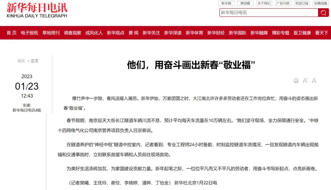 1月23日,青海日报发表文章《他们,用奋斗画出新春“敬业福”》,聚焦万家团圆之时,身处大江南北的那些仍旧奔忙在工作岗位上的劳动者,中铁十四局电气化公司南京管养项目负责人吕宗泰接受采访。