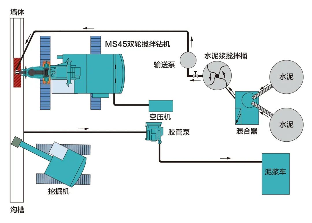 CSM工法主要以MS45E双轮搅拌钻机进行施工,主要用于建筑物基坑、地下停车场、地铁车站、地下商业街、水库大坝、环保工程等深基础项目中的止水帷幕、挡土墙的施工。