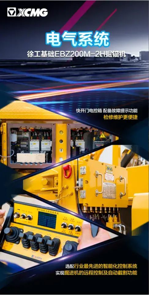 EBZ200M-2H掘锚机,电器系统具有智能电控及保护功能,可选配智能远程控制系统,实现远程集中控制、工作场景三维再现、高精度定位导航、自动截割等功能,帮助施工人员远离噪音粉尘,降低施工强度,有效保护人员安全。