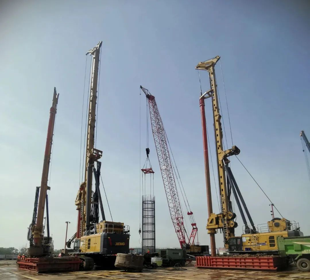 池州长江公铁大桥由中铁大桥局集团有限公司承建,我公司主要负责4#主墩桩基施工任务,桩径2.8m,平均钻孔深度138.5米,设计桩长112米,地质岩层主要为弱风化粉质泥岩、弱风化泥岩。根据旭腾基础以往总结的施工经验,本项目采用逐级扩孔的施工工艺,投入XR800HD旋挖钻机二台、XR700E旋挖钻机一台、XR580HD旋挖钻机三台共计六台旋挖钻机。配备旭腾基础精锐的施工队伍,在中铁大桥局集团有限公司的正确领导下,定不辱使命,不负池州百姓,保证高质高效的完成任务。